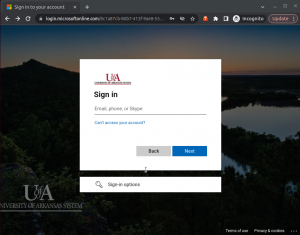2. You will be redirected to the UofA System Single Sign On (SSO) page. Following the prompts, enter your UASYS username (ex: jondoe@uark.edu, janedoe@ualr.edu), and complete the 2FA step